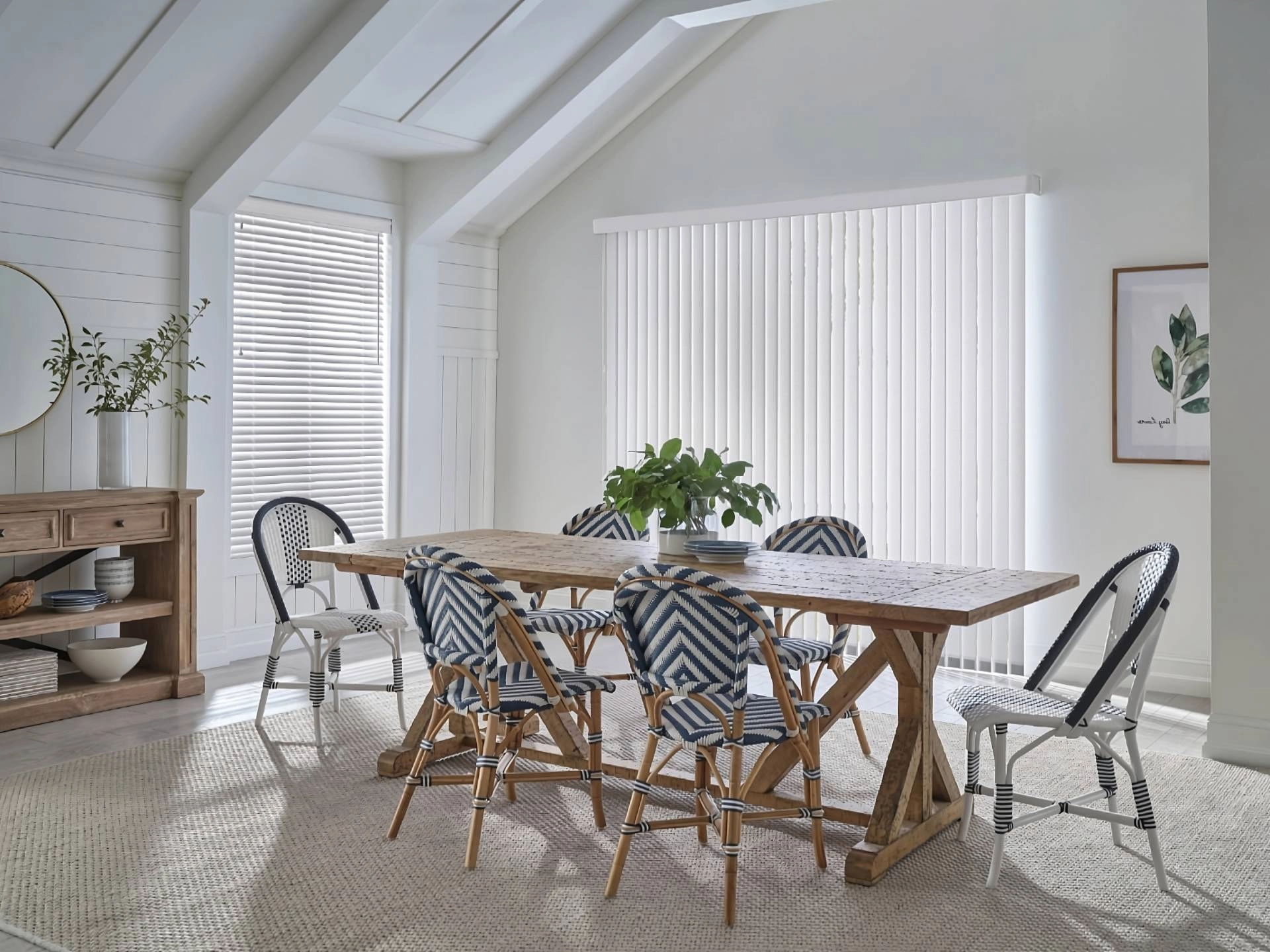 As for installation options, inside mounts give you a clean, built-in look, while outside mounting makes windows appear larger. That second choice can also provide better light blockage around the edges. If you want more light blockage and added insulation, consider layering your sliding vertical blinds with custom drapery. We often suggest that for living rooms, dining rooms, and bedrooms.